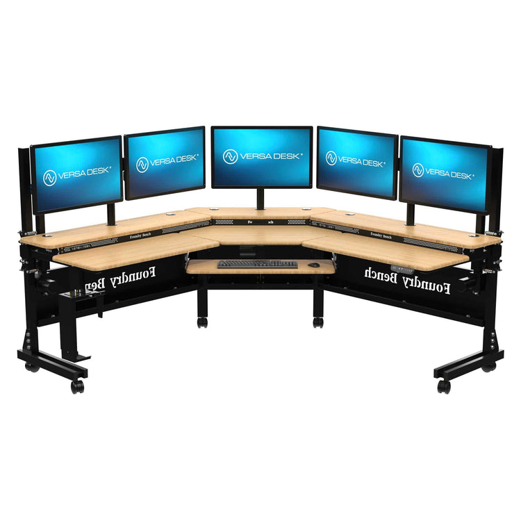 This 80" smart ergonomic control center studio desk features three powerful motors for smooth height adjustments, a durable 1" bamboo wood desktop, and a split-level design for optimal posture. It includes a smart controller with up/down functions, programmable settings, and mobile app control. With pre-drilled grommet holes for multi-monitor setups, heavy-duty casters for mobility, and built-in USB and USB-C charging ports, this desk is designed to upgrade your workspace and enhance both productivity and style. Handcrafted in Los Angeles, California, the Foundry Bench® stands as a testament to quality and innovation.