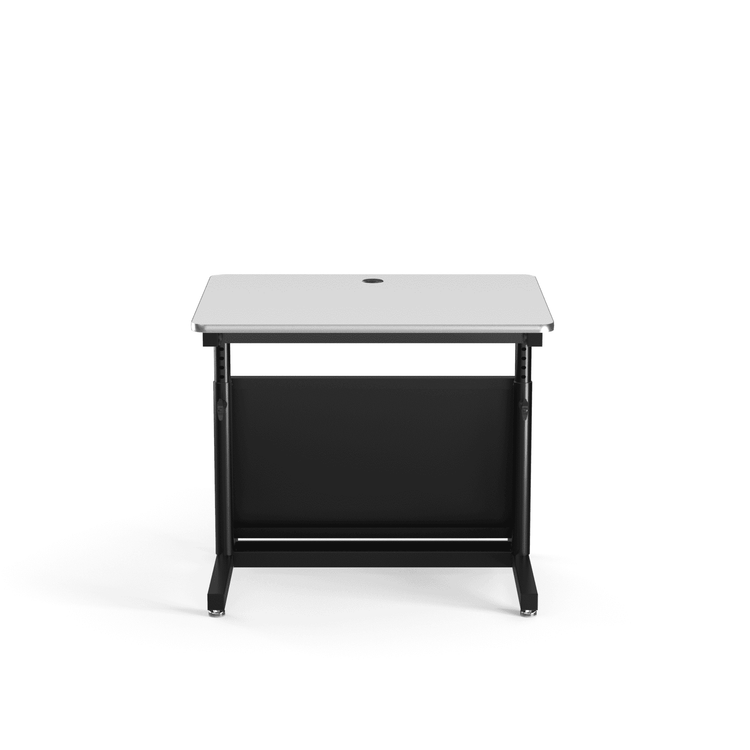 Our Deluxe Adjustable Height Classroom table is heavy duty with an adjustable leg design. The adjustment is a manual spring-loaded pop-pin action that can be twisted and tightened into place to avoid tampering or unauthorized adjustment . The vertical steel tube leg has 14 pre-drilled holes for height selection. The table will adjust to a low seated 24” position up to a full standing 36” position (wheel kits may increase height); this will accommodate K-12 & college level students. The adjustment system is meant for long term height configurations. The adjustment mechanism is a two function system: consisting of spring loaded pull pin and twist tight lock positions that secure the tube in position so the table cannot rock or be accidentally adjusted. This extremely sturdy table has been manufactured for the past 20 years in our Los Angeles, CA factory. These tables can be set up for technical training workstations with one or two users. The table is constructed with a steel frame that is designed with preconfigured holes and mounts that will enable this table to transform into over 30 different configurations or combinations. We also carry an extensive variety of monitor arms for mounting 1- 6 monitors. . Many of the public and private school systems enjoy this table because it can be used as a simple activity classroom table for general studies or can be set up for your most elaborate computer lab environment. One table that does it all !! Call and speak to our Classroom Table Specialist for more details.