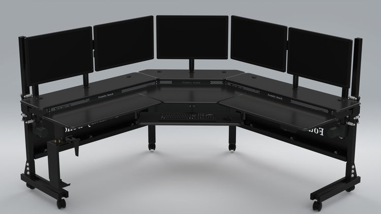 This 80" smart ergonomic control center studio desk features three powerful motors for smooth height adjustments, a durable 1" bamboo wood desktop, and a split-level design for optimal posture. It includes a smart controller with up/down functions, programmable settings, and mobile app control. With pre-drilled grommet holes for multi-monitor setups, heavy-duty casters for mobility, and built-in USB and USB-C charging ports, this desk is designed to upgrade your workspace and enhance both productivity and style. Handcrafted in Los Angeles, California, the Foundry Bench® stands as a testament to quality and innovation.