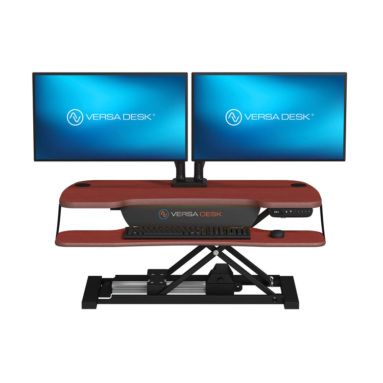 PowerPro Elite Electric Standing Desk Converter with Programmable Switch, USB Port and Mobile APP - Black / 36" x 24" / Cherry Wood Grain is backordered and will ship as soon as it is back in stock.